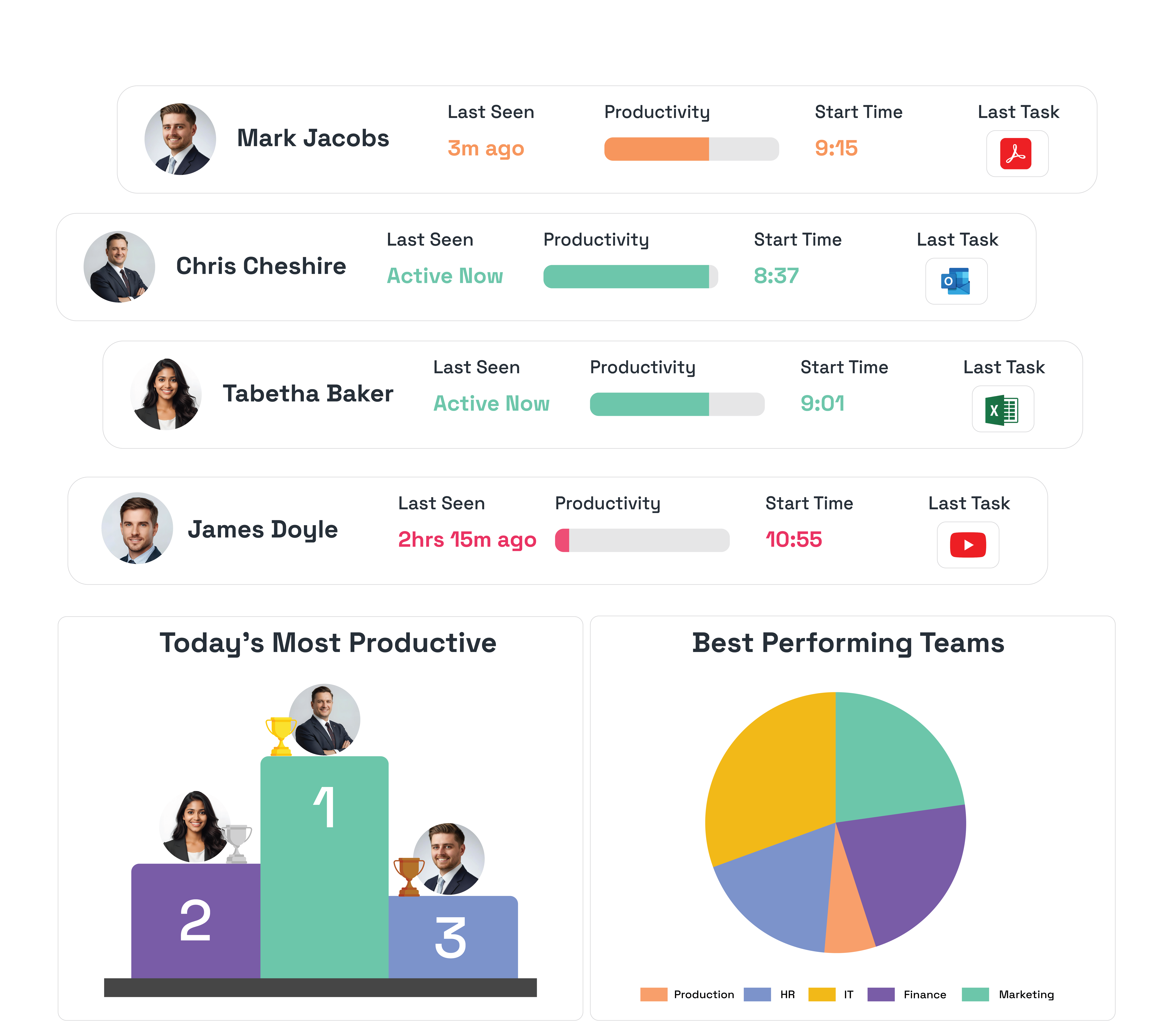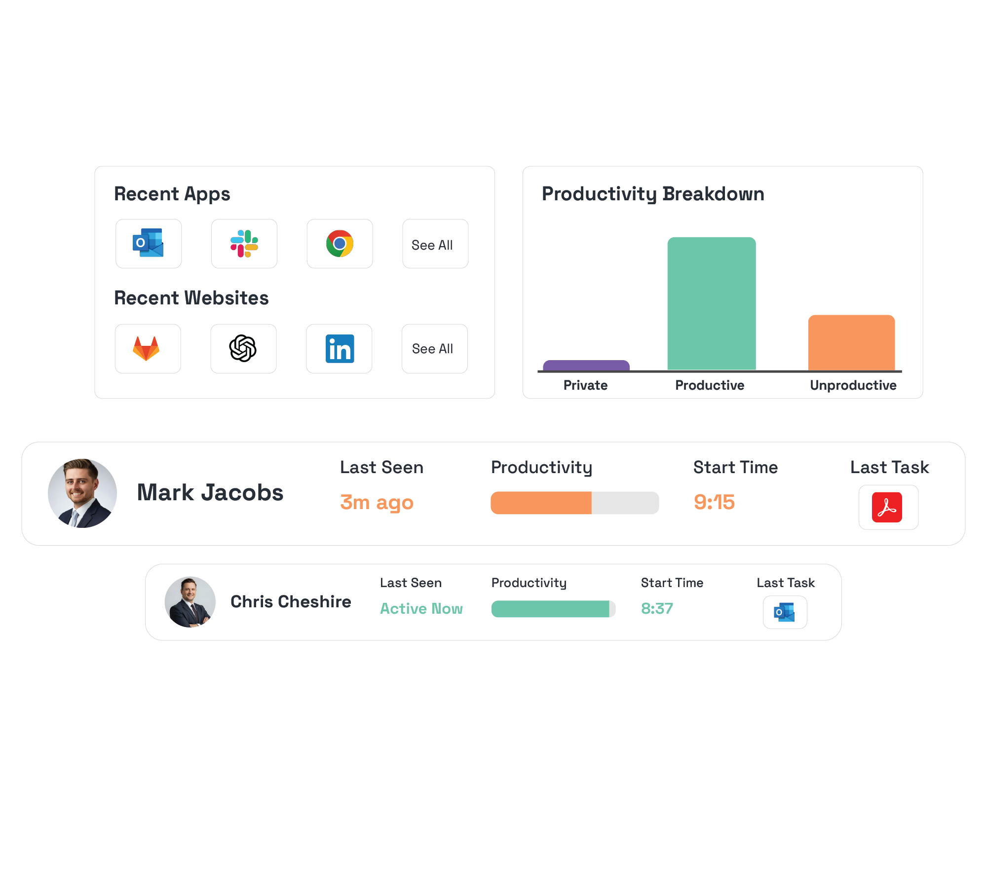 View daily work activity and long-term productivity trends, helping you support employees in improving performance and developing healthier work habits.
