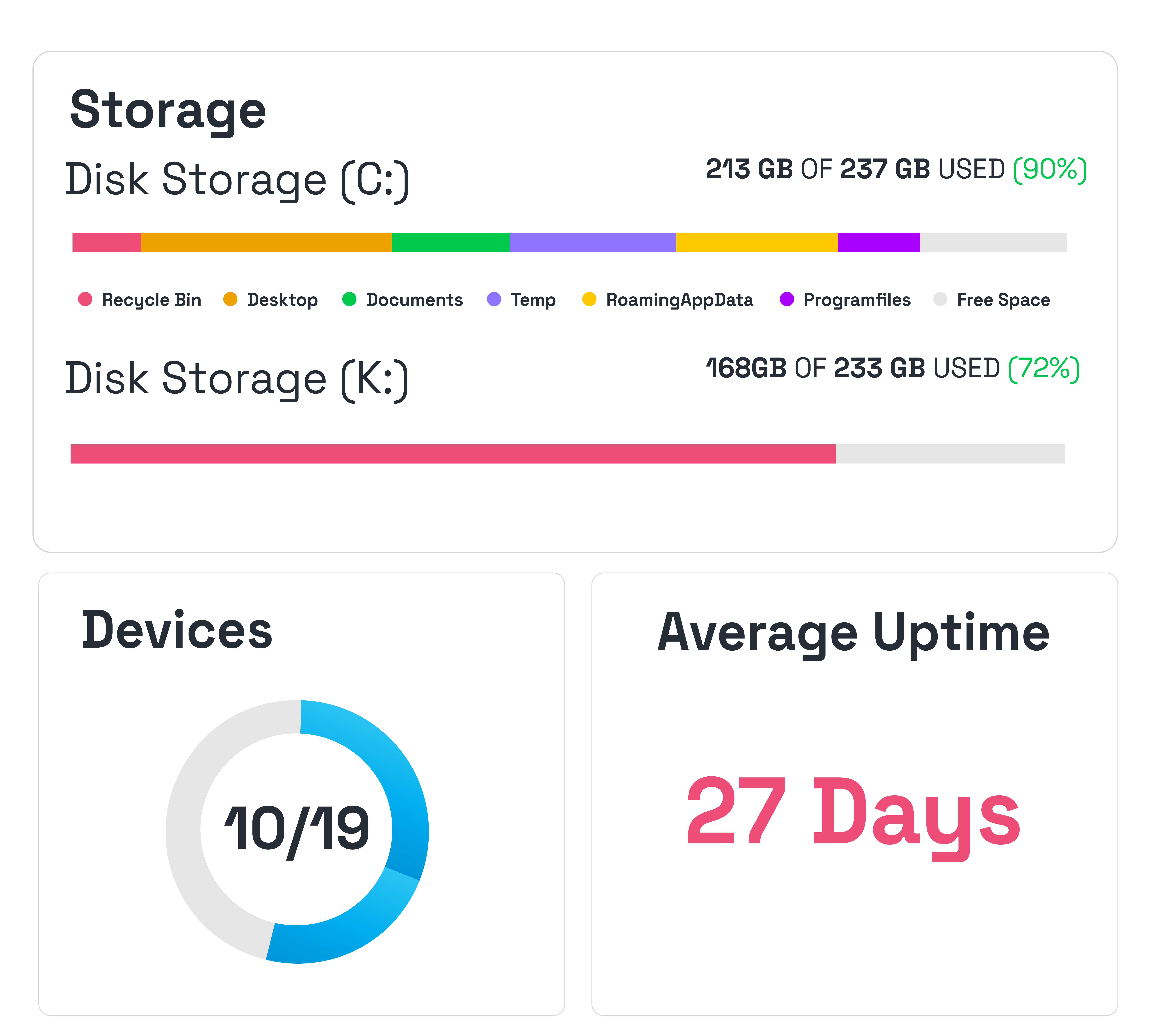 Understand how storage is being used across your devices. Identify low disk space, large files, and usage patterns so you can prevent storage-related issues before they impact systems.