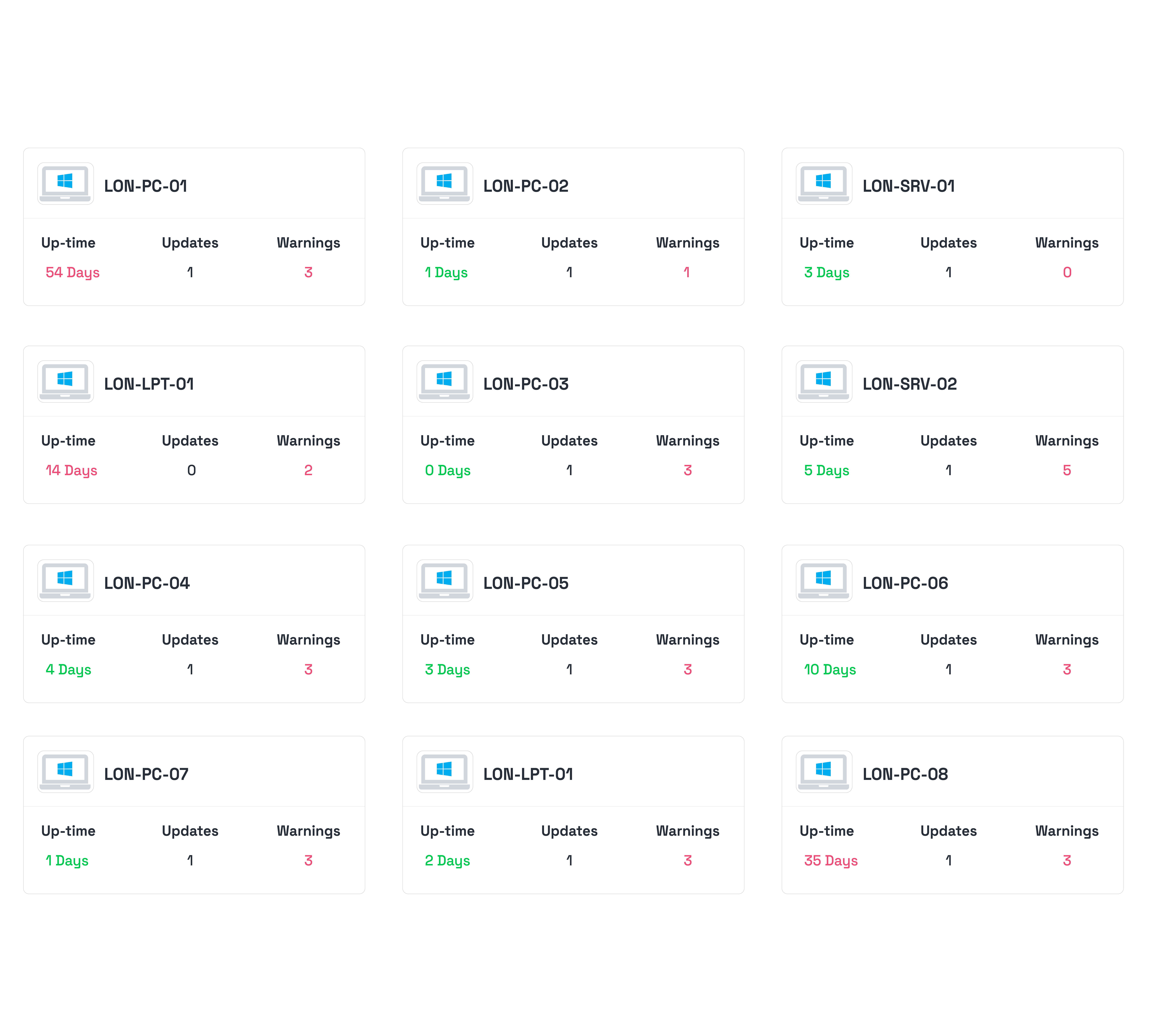 The platform monitors Windows devices connected to your network, including desktops, workstations, and servers. Each device reports system health, hardware information, storage usage, and update status to the dashboard.