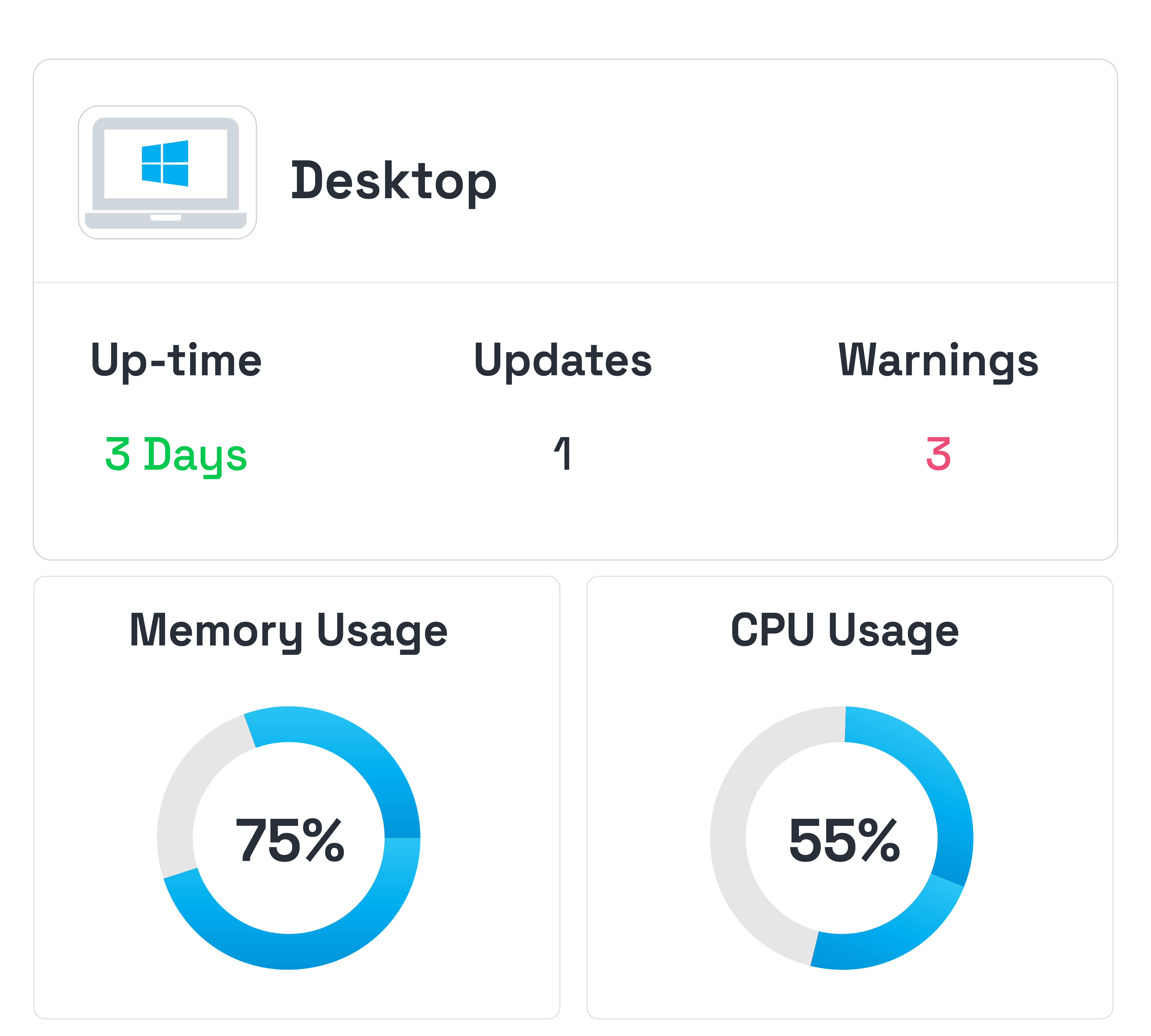 Monitor the performance and health of your devices in real time. Track CPU usage, memory consumption, uptime, and system activity to quickly identify issues before they affect productivity.